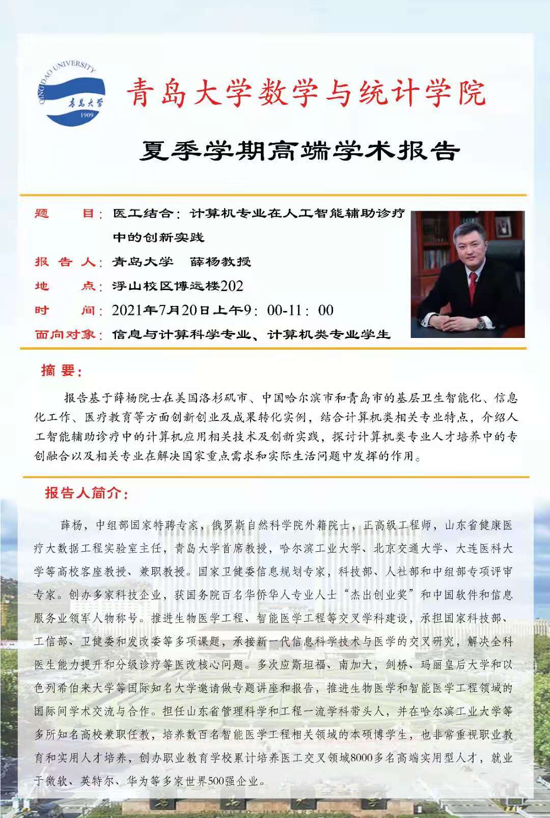 2021年7月20日9:00-11:00,伟德国际1946官方网夏季学期第八场高端学术报告在腾讯会议线上举行,中组部国家特聘专家、俄罗斯自然科学院外籍院士、伟德国际1946官方网健康医疗大数据研究中心主任薛杨教授作了“医工结合:计算机专业在人工智能辅助诊疗中的创新实践”的创新创业类高端学术报告,伟德国际1946官方网副院长丁洁玉主持报告。