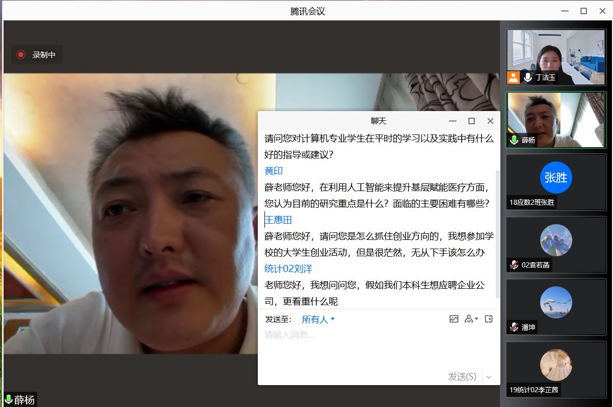 薛杨教授从个人创业经历讲起,基于在美国洛杉矶市、中国哈尔滨市和青岛市的基层卫生智能化、信息化工作、医疗教育等方面创新创业及成果转化实例,结合计算机专业特点,介绍了云计算、大数据、人工智能等方面创新实践内容,并探讨了计算机相关专业人才培养中的专创融合以及计算机相关专业在解决国家重点需求和实际生活问题中发挥的作用。