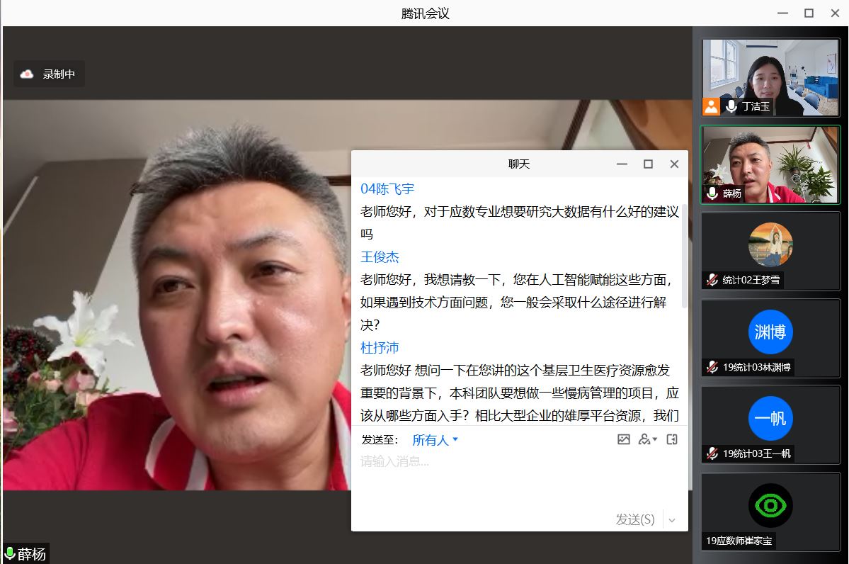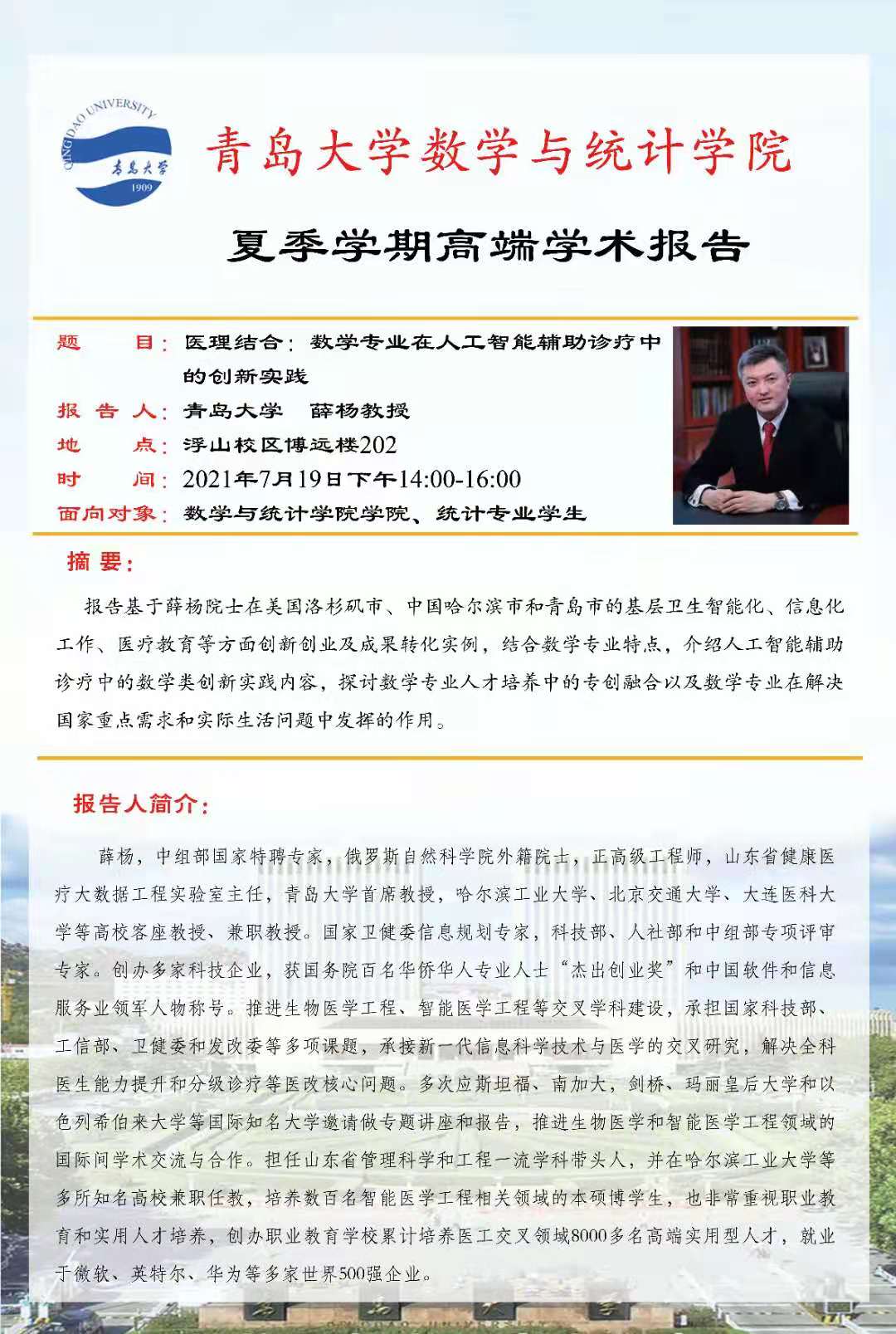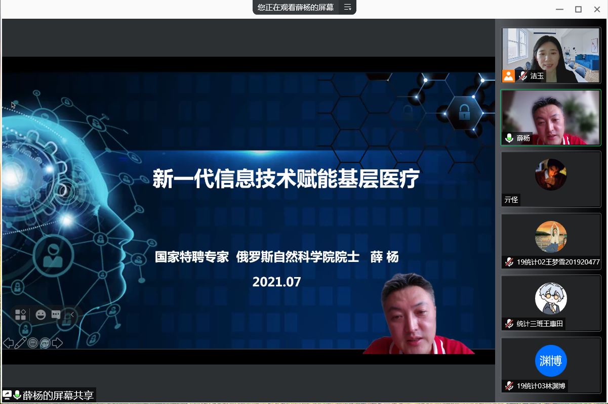 2021年7月19日14:00-16:00,伟德国际1946官方网夏季学期第七场高端学术报告在腾讯会议线上举行,中组部国家特聘专家、俄罗斯自然科学院外籍院士、伟德国际1946官方网健康医疗大数据研究中心主任薛杨教授作了“医理结合:数学专业在人工智能辅助诊疗中的创新实践”的创新创业类高端学术报告,伟德国际1946官方网副院长丁洁玉主持报告。