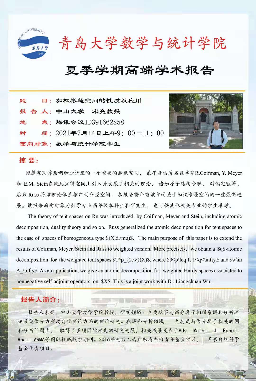 2021年7月14日9:00-11:00,伟德国际1946官方网夏季学期第三场高端学术报告在线上举行,来自中山大学的国家优秀青年基金获得者宋亮教授为伟德国际1946官方网师生作了题为“加权帐篷空间的研究”的学术报告,介绍了加权帐篷空间的发展历史和研究现状,以及一些最新的科研工作。