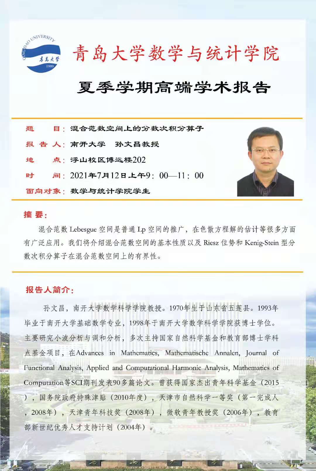 2021年7月12日9:00-11:00,伟德国际1946官方网夏季学期第一场高端学术报告在博远楼202教室举行,来自南开大学的国家自然科学杰出青年基金获得者孙文昌教授为伟德国际1946官方网师生作了题为“混合范数空间上的分数次积分算子”的学术报告,介绍了混合Lebesgue空间的发展历程和研究现状,以及若干最新的研究进展。