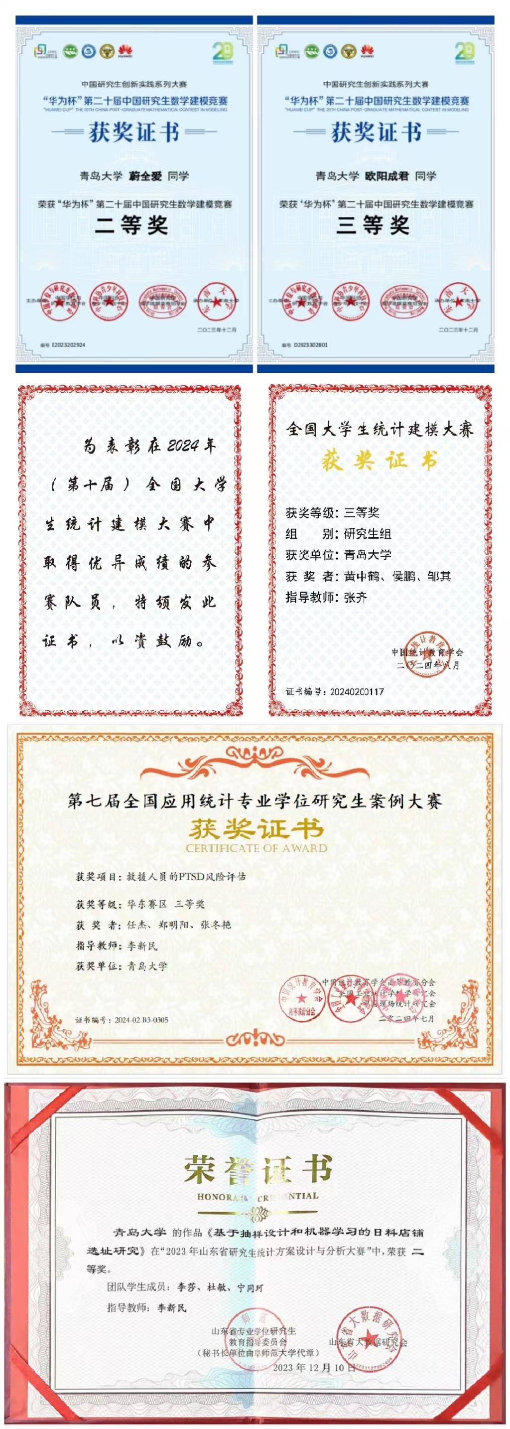 山东省研究生统计方案设计与分析大赛,二等奖1项,三等奖1项;