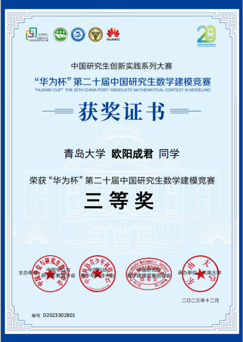 “华为杯”第二十届中国研究生数学建模竞赛,二等奖1项,三等奖1项;