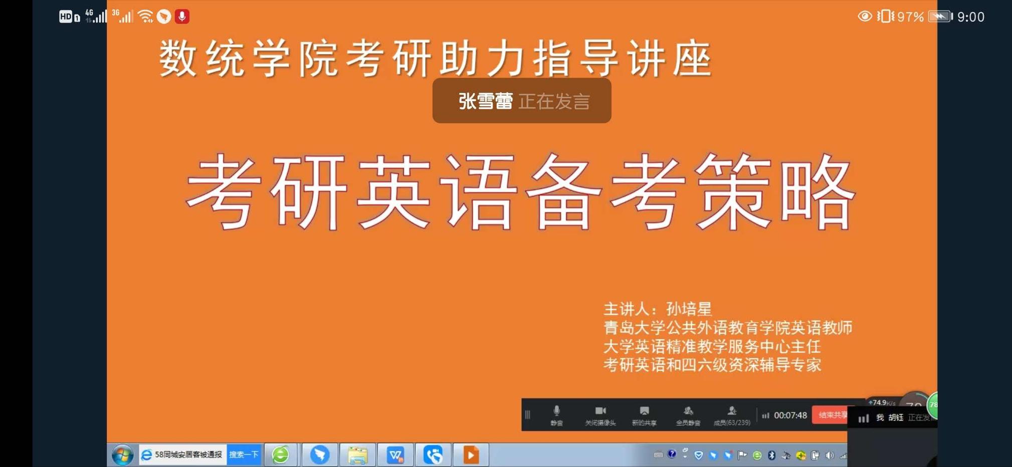 7月9日上午,伟德国际1946官方网以钉钉线上视频的方式举办第一期“考研助力”主题讲座之考研英语备考策略讲座。公共外语教育学院大学英语精准教学服务中心主任、考研英语和四六级资深辅导专家孙培星老师主讲,2017级考研学生和部分备考六级的同学参加,讲座由学院党委副书记张雪蕾主持。