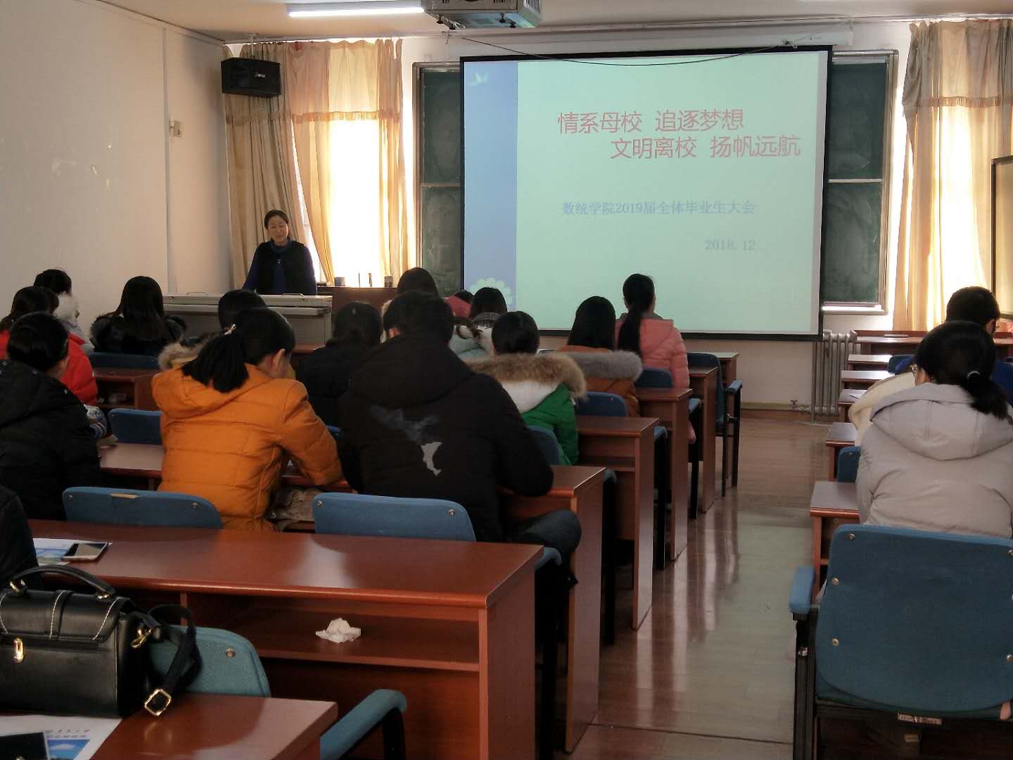 会上,李玲慧首先结合习近平总书记在改革开放40周年大会上的重要讲话精神,倡议同学们向改革先锋学习,牢记习近平总书记对广大青年的希望,增强本领,不忘时代使命,树立远大理想。然后从就业派遣、省内外签约、解约流程、就业形式等方面详细介绍了毕业手续。强调同学们在就业过程中要充分利用学校发布就业信息的相关平台,积极参加招聘会,不断提高自身的就业能力,发挥就业优势,更好、更快的找到理想工作。