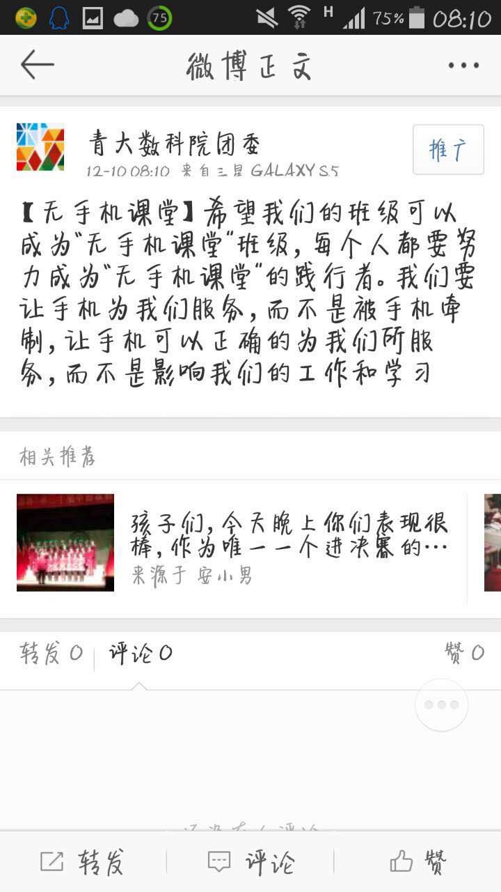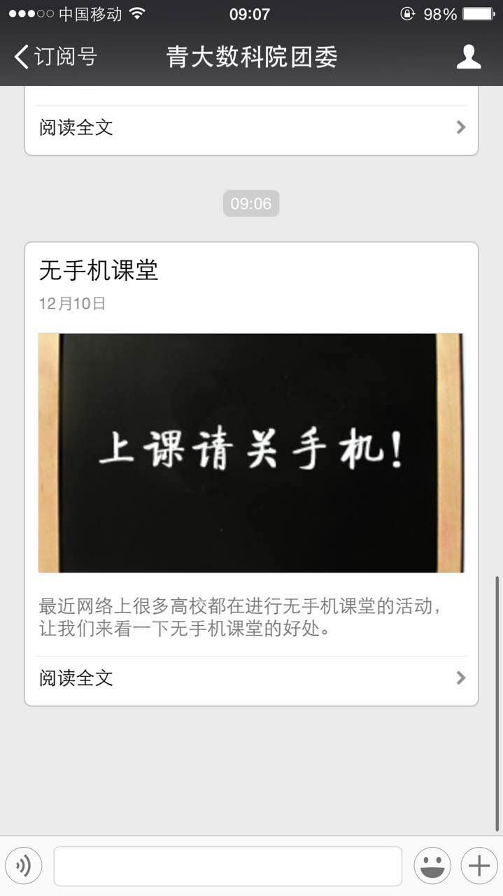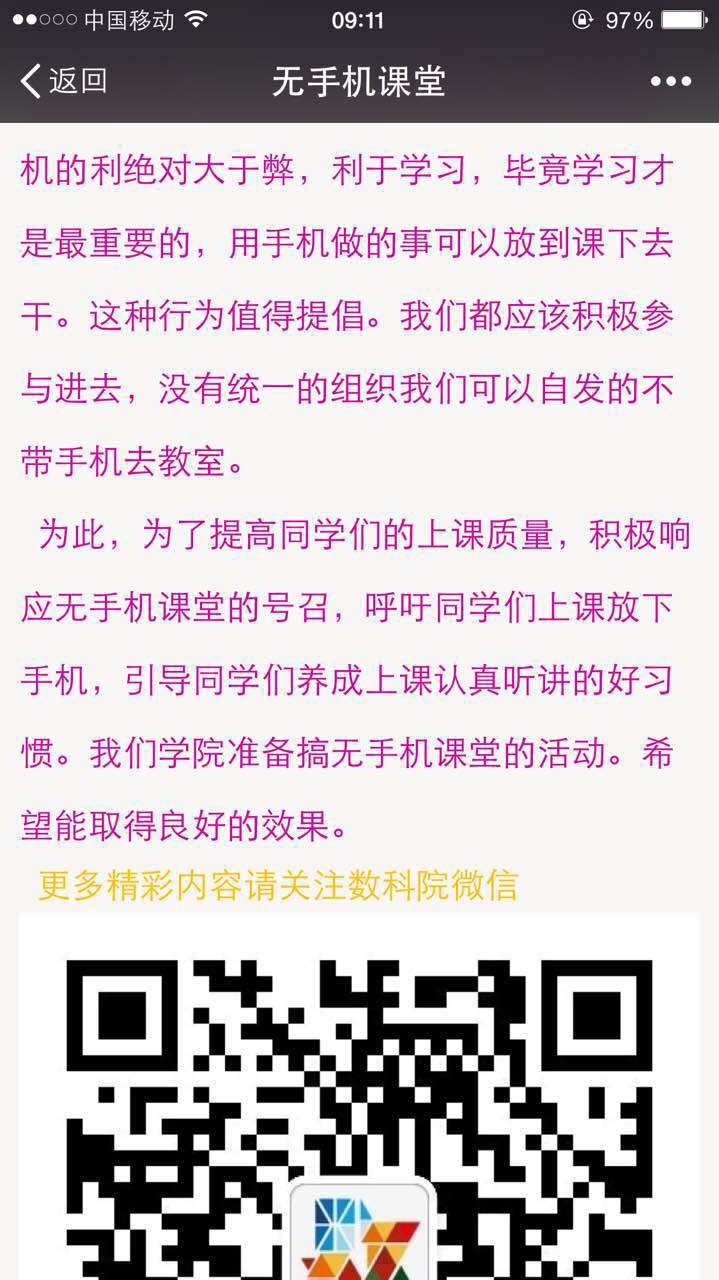 数学科学学院学生会围绕“无手机课堂”的主题,通过微信、微博等宣传手段,撰写文章,呼吁更多的同学主动加入到这项活动中。