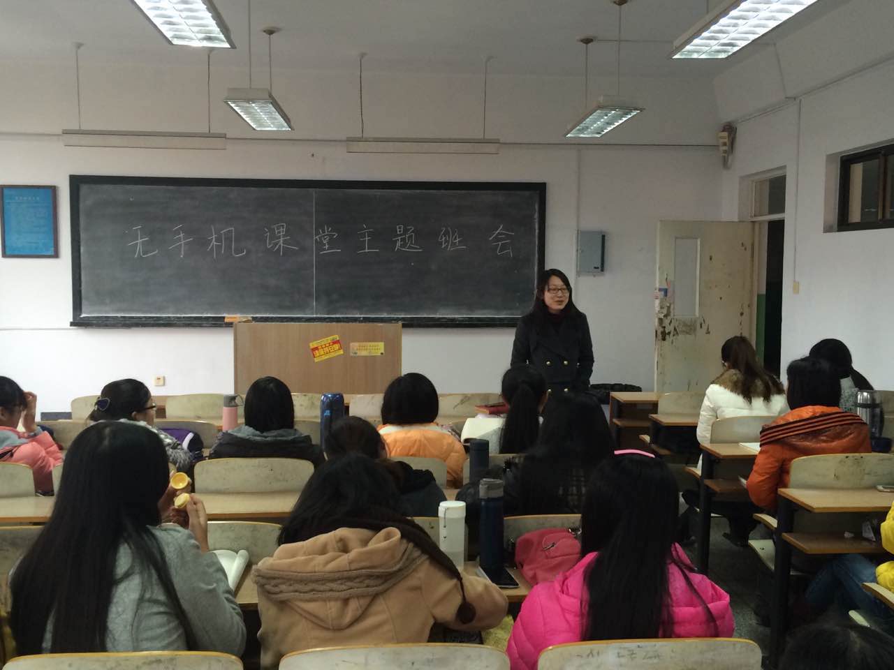 在各班召开主题班会之前,两位辅导员老师分别召开了班委会,首先对学生干部进行无手机课堂的介绍、宣讲,带领班级干部学习通知内容,领会通知精神。班委会上,本班班长团支书积极献言献策,表达自己对无手机课堂的理解,建议采取的措施主要有两方面,第一是上课手机调静音,还课堂以宁静。第二可以考虑制作手机袋,上课时每位同学将手机放入手机袋内,写上名字,由几名班委负责保管,下课后归还同学。之后,各班分别召开了主题班会,积极宣传无手机课堂的观念,班长团支书以身示范,起到模范带动作用,带动鼓励全班同学积极融入无手机课堂活动,各班召开主题班会,同时也正式启动无手机课堂活动。今后,各班将根据班级具体情况,及时调整相关政策,将无手机课堂活动深入开展下去。