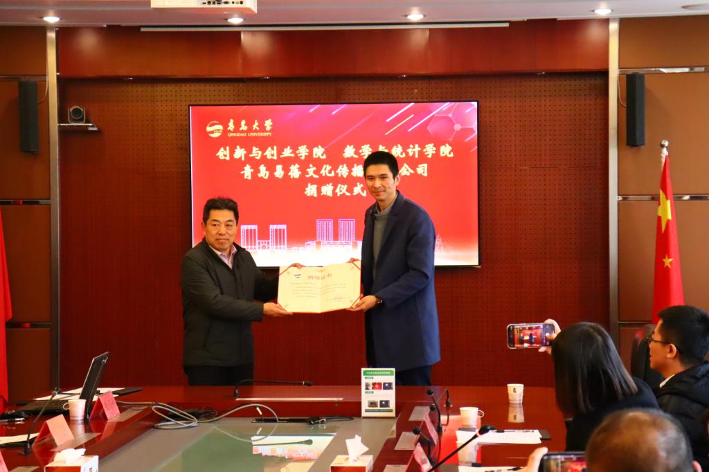仪式上,徐春龙代表青岛易蓓文化传媒有限公司向杜方波书记交接捐赠支票,杜方波代表学校向徐春龙校友颁发捐赠证书。
