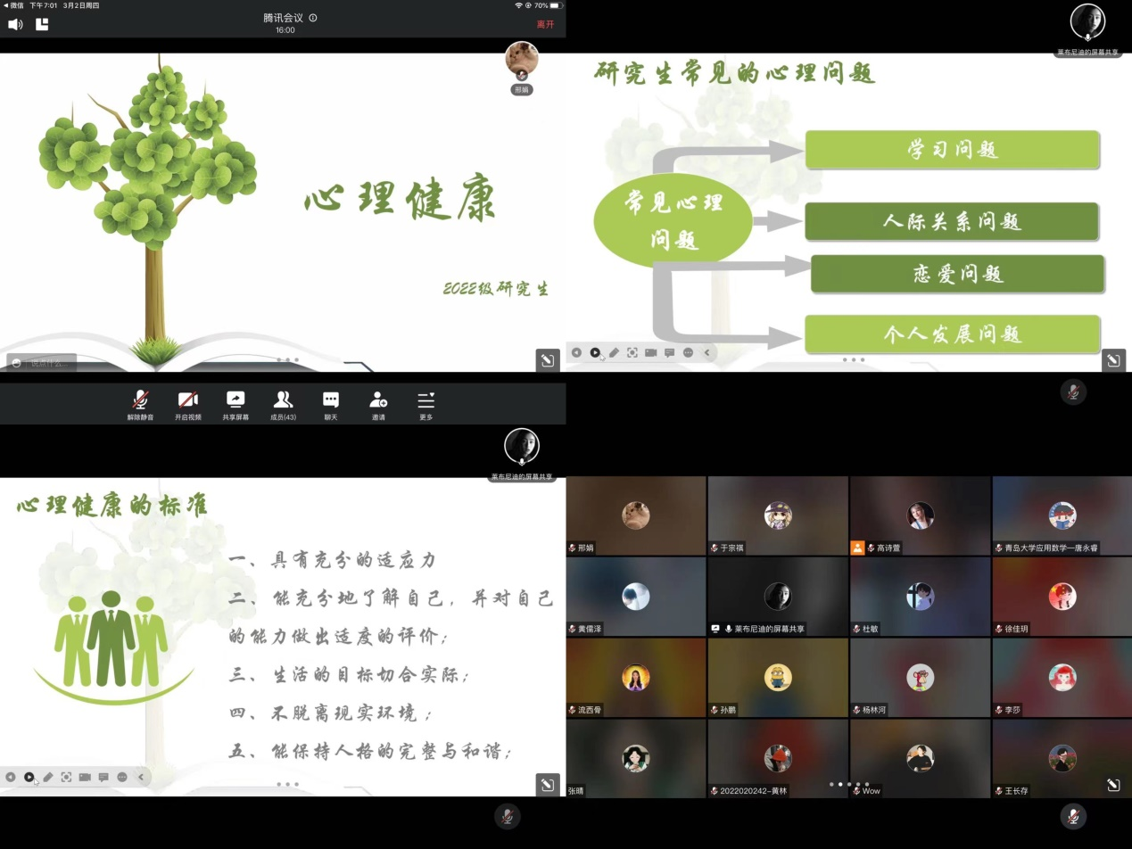 研究生班级围绕心理健康的意义、心理健康的标准与学生常见的心理问题三个问题展开交流,各班心理委员主持会议。经过本次朋辈互助交流会增强了同学们对心理健康知识的了解帮助广大研究生以积极乐观的心态应对科研和生活上的压力
