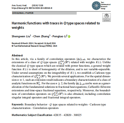 近日,伟德国际1946官方网2021级数学与应用数学专业本科生刘盛文以第一作者在《Annals of Functional Analysis》上发表题为“Harmonic functions with traces in Q type spaces related to weights”的长篇研究论文,(https://doi.org/10.1007/s43034-024-00363-8)。该杂志是泛函分析与调和分析领域中的SCI期刊。指导教师和通讯作者为李澎涛教授。