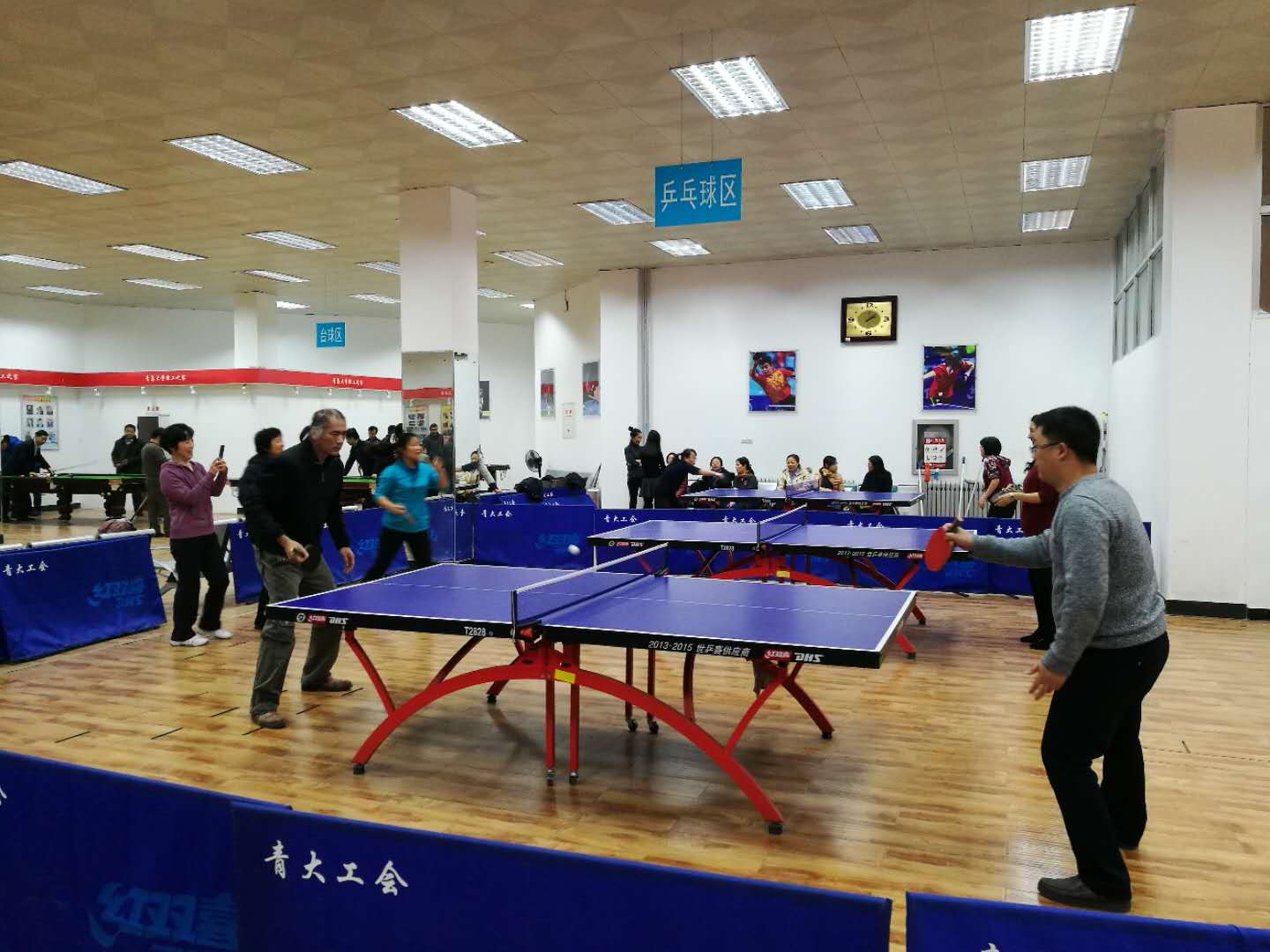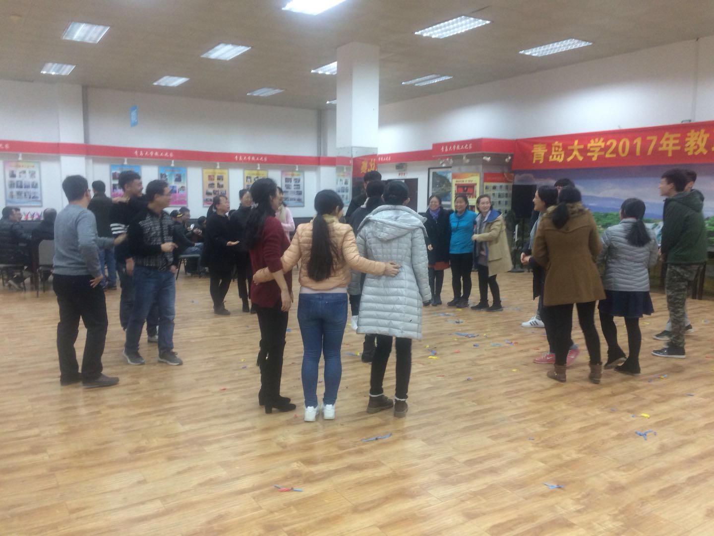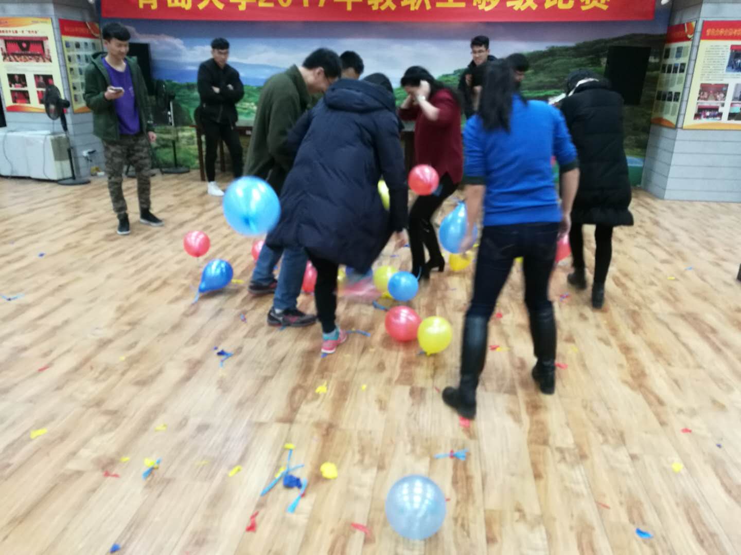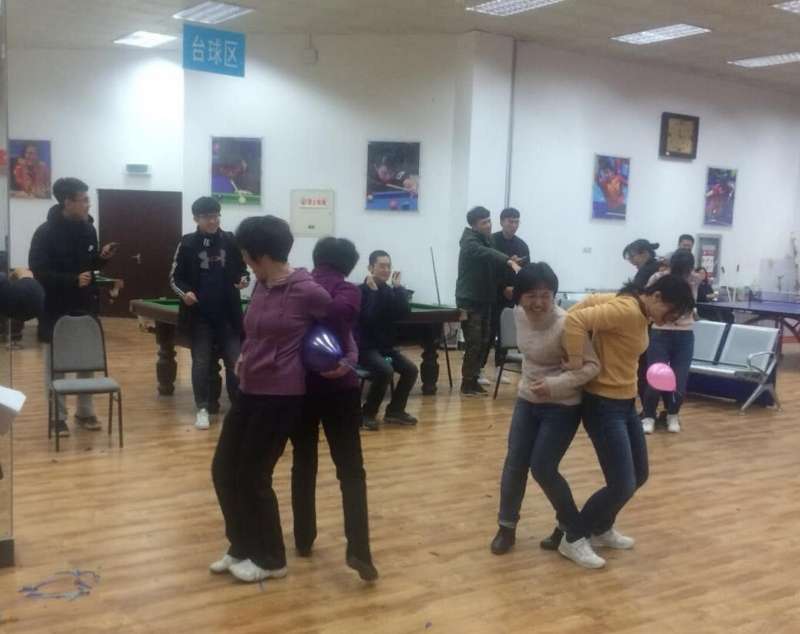 联欢会有两个集体活动,分别为“遍地开花踩气球”、“两人夹气球接力跑”。每个活动都有六个工会小组参加,比赛分为两场。第一场是数学系、计数系和统计系,第二场是公数部、数学教育系以及院机关。经过激烈角逐,“遍地开花踩气球”活动的冠亚季军分别为统计系、数学系、计数系;“两人夹气球接力跑”活动前三名为公数部、院机关、计数系。“N人抱成团”活动,大家围成圆圈,根据裁判举出的数字牌随机组合抱团,考验大家的反应速度和团队协作能力。选手们在场上全力投入,本着“友谊第一、比赛第二”的精神,赛出了水平,亮出了风格。在比赛进行的同时,还有部分老师进行棋牌、乒乓球以及台球比赛,各赛场活动竞相进行,将联欢会气氛推向高潮。