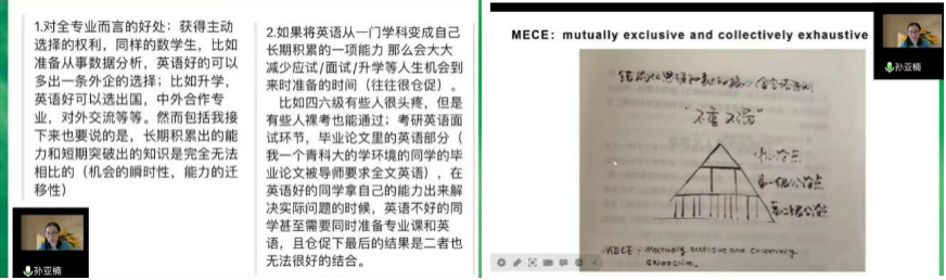 讲座中,孙亚楠从“大学英语学习规划与方法”“听说与读写能力的提高”“四级备考与竞赛参与”三方面为学生进行指导,她提出的“MECE”方法新颖独特,为同学们提供了英语学习的高效提高办法。孙副教授以“Practice makes perfect!”作为讲座结束语,鼓励同学们克服畏难心理、坚定学习信心并投入应有的时间和精力,期待同学们能够找到英语学习兴趣并不断提高英语水平。