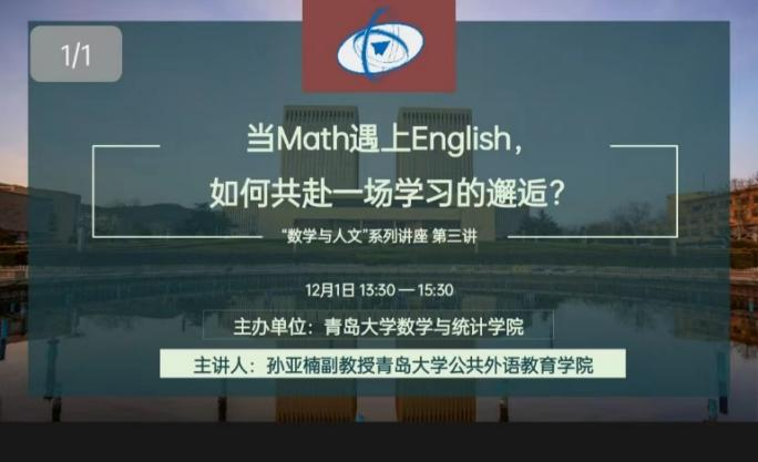 为培养多学科交叉融合型人才,增强学生人文素养,12月1日13:30,伟德国际1946官方网“数学与人文”系列讲座第三讲——“当Math碰上English,如何共赴一场学习的邂逅”线上开讲。本次讲座由伟德国际1946官方网公共外语教育学院孙亚楠副教授主讲,伟德国际1946官方网2022级全体学生认真听会学习。