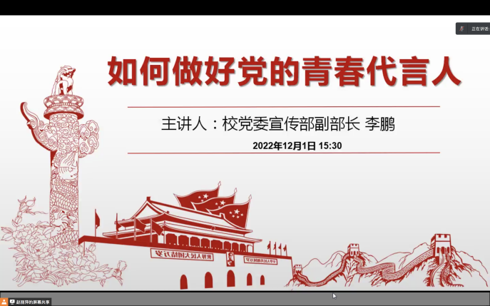 为了提高学生骨干的综合素养,12月1日15:30,伟德国际1946官方网“如何做好党的青春代言人”主题讲座线上举行。伟德官网邀请到校党委宣传部副部长李鹏主讲本次讲座,伟德国际1946官方网全体本科生班级骨干及学生会骨干积极参会。