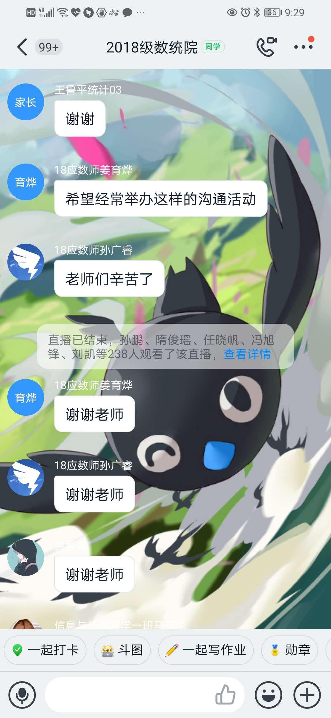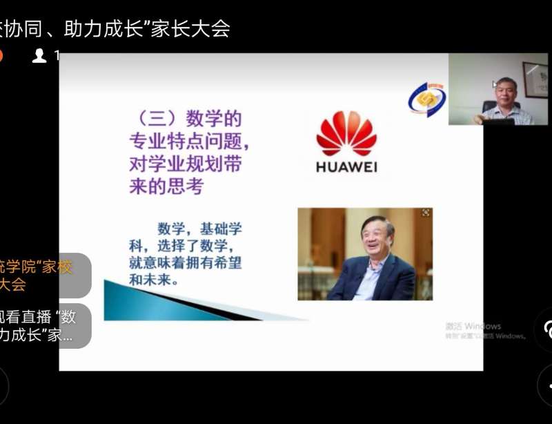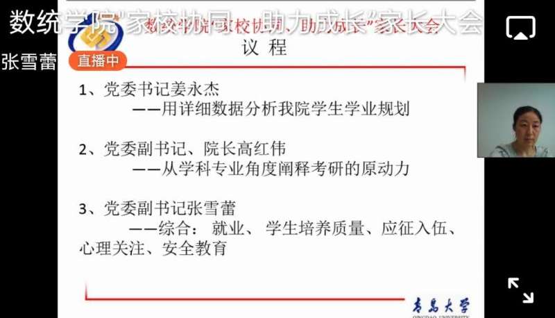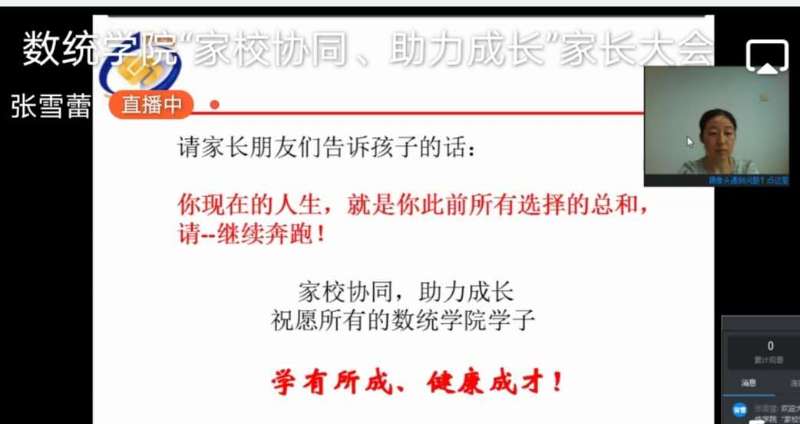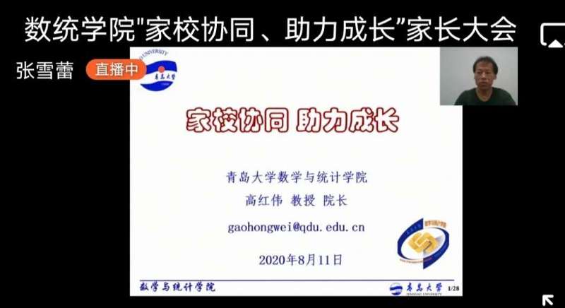 8月11日晚7:30,为实现全员育人、协同育人,数学与统计学院面向2017级、2018级、2019级三个年级本科生的家长们,以钉钉会议线上直播的方式召开“家校协同,助力成长”家长大会,2017级暑期在校学生的家长也通过单独的家长钉群联群参会。会议由学院党委书记姜永杰书记、院长高红伟主讲,党委副书记张雪蕾主持,学院班子全体成员及辅导员老师,以及约七百三十多名家长共同参加。